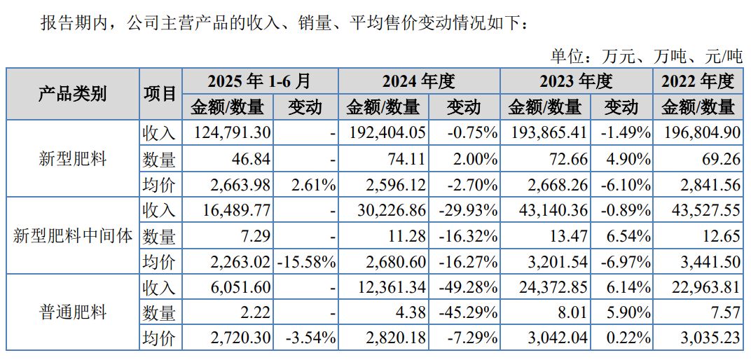 營收下滑的背后,是其三大主業(yè)不同程度出現(xiàn)萎縮。比如,新型肥料業(yè)務(wù)營收從2022年的19.68億元降至2024年的19.24億元,均價從2842元/噸降至2596元/噸;同期,新型肥料中間體業(yè)務(wù)營收從4.35億元降至3.02億元,均價從3442元/噸降至2681元/噸;普通肥料業(yè)務(wù)營收從2.3億元降至1.24億元,均價從3035元/噸降至2820元/噸。