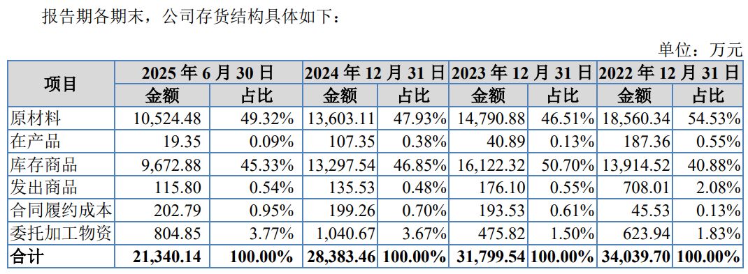 存貨結(jié)構(gòu)中,原材料和庫存商品占比最高,兩者比例均在40%以上。其中,原材料占比一度高達(dá)54.53%,庫存商品占比最高也曾達(dá)到50.70%。值得注意的是,公司對存貨跌價準(zhǔn)備的計提相對克制,報告期各期末計提金額在566.99萬元至661.60萬元之間,計提比例介于1.67%至2.87%。