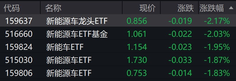 受盤面影響,跟蹤中證新能源汽車指數(shù)的ETF跌約2%。