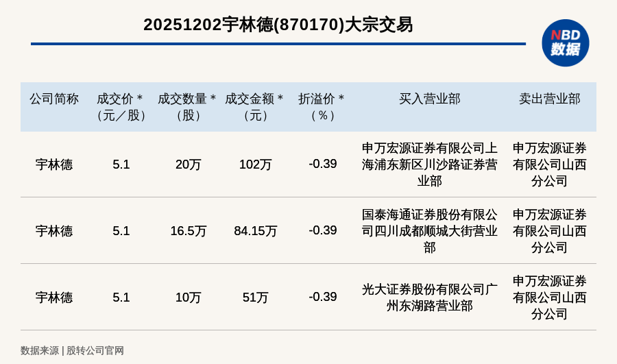每經(jīng)訊,2025年12月2日,新三板創(chuàng)新層公司宇林德(870170,收盤價:5.12元)發(fā)生3筆大宗交易,總成交金額為237.15萬元,成交金額最高的一筆成交價5.1元/股,成交數(shù)量20萬股,成交金額102萬元,折價0.39%。買入營業(yè)部是申萬宏源證券有限公司上海浦東新區(qū)川沙路證券營業(yè)部,賣出營業(yè)部是申萬宏源證券有限公司山西分公司。