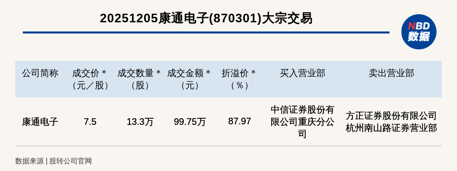 每經(jīng)訊,2025年12月5日,新三板創(chuàng)新層公司康通電子(870301,收盤價:3.99元)發(fā)生一筆大宗交易,成交價7.5元/股,成交數(shù)量13.3萬股,成交金額99.75萬元,溢價87.97%。買入營業(yè)部是中信證券股份有限公司重慶分公司,賣出營業(yè)部是方正證券股份有限公司杭州南山路證券營業(yè)部。