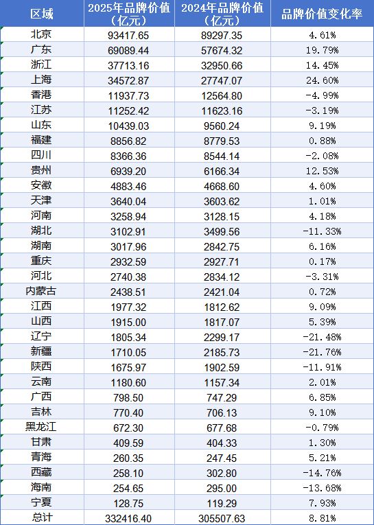 榜單顯示,共有7個(gè)區(qū)域的2025年品牌價(jià)值超過萬億元,比去年增加了一個(gè)。其中,北京以9.3萬億元的品牌價(jià)值位居第一;廣東、浙江、上海三地的品牌價(jià)值均增長較快,增幅超過10%,位居二至四名;香港、江蘇略有下降;山東成新晉萬億元省份。在這些品牌價(jià)值超過萬億元的區(qū)域之后,第八名至第十名分別為福建、四川和貴州。