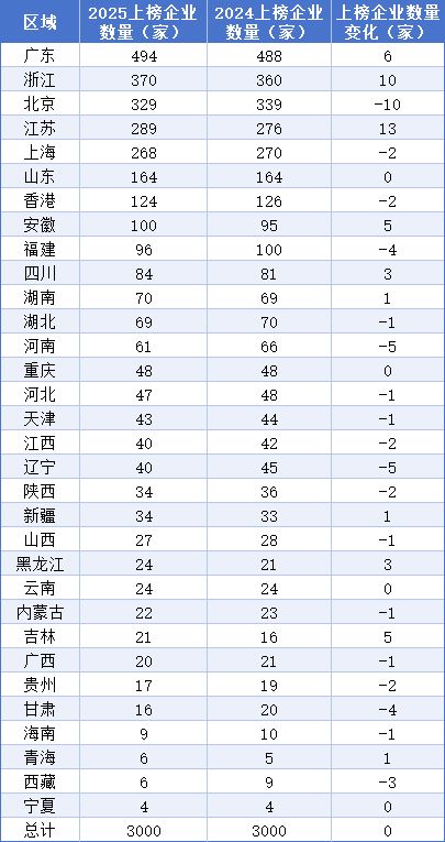 2025年中國各區(qū)域上榜企業(yè)數(shù)量及其變化