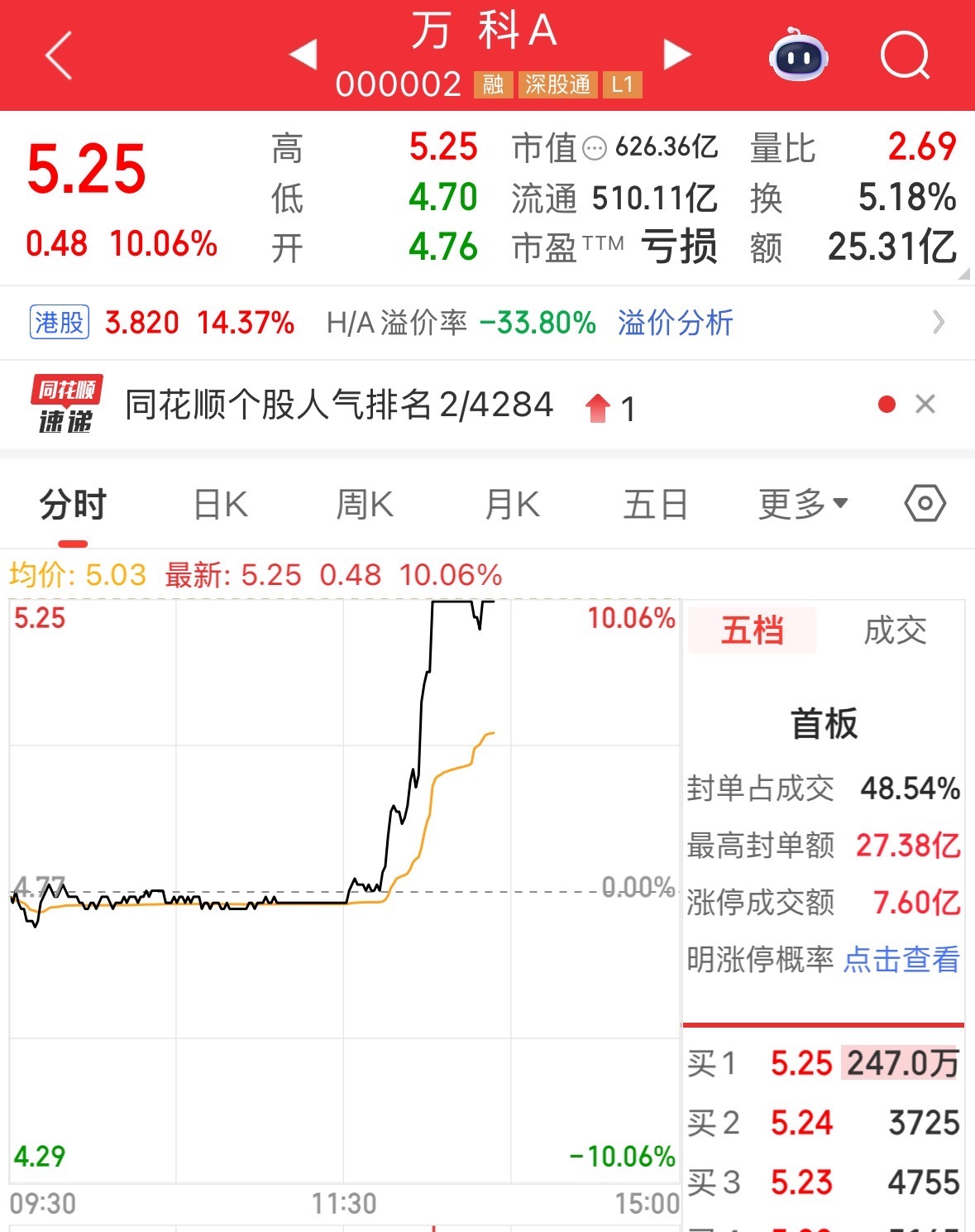 12月10日午后,萬科A直線拉升封漲停,封單金額超27億元。