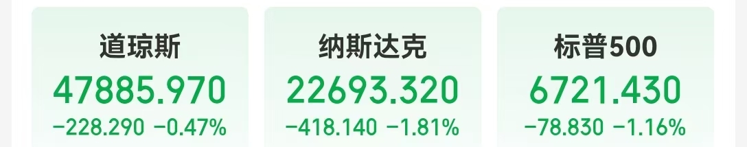 當(dāng)?shù)貢r(shí)間12月17日,美股三大指數(shù)集體收跌。道指跌0.47%;納指下跌418.14點(diǎn),跌幅1.81%;標(biāo)普500指數(shù)跌1.16%。