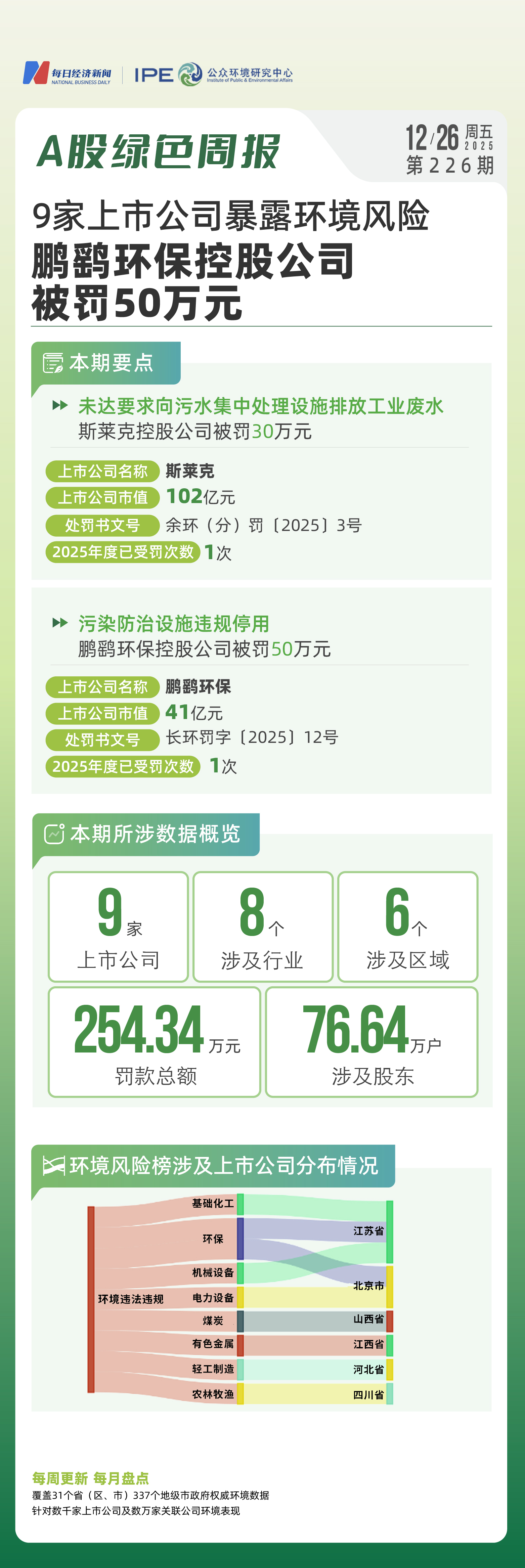 2025年12月第四周,哪些上市公司的環(huán)境保護與信披責任亮起了紅燈?且看A股綠色周報第226期。