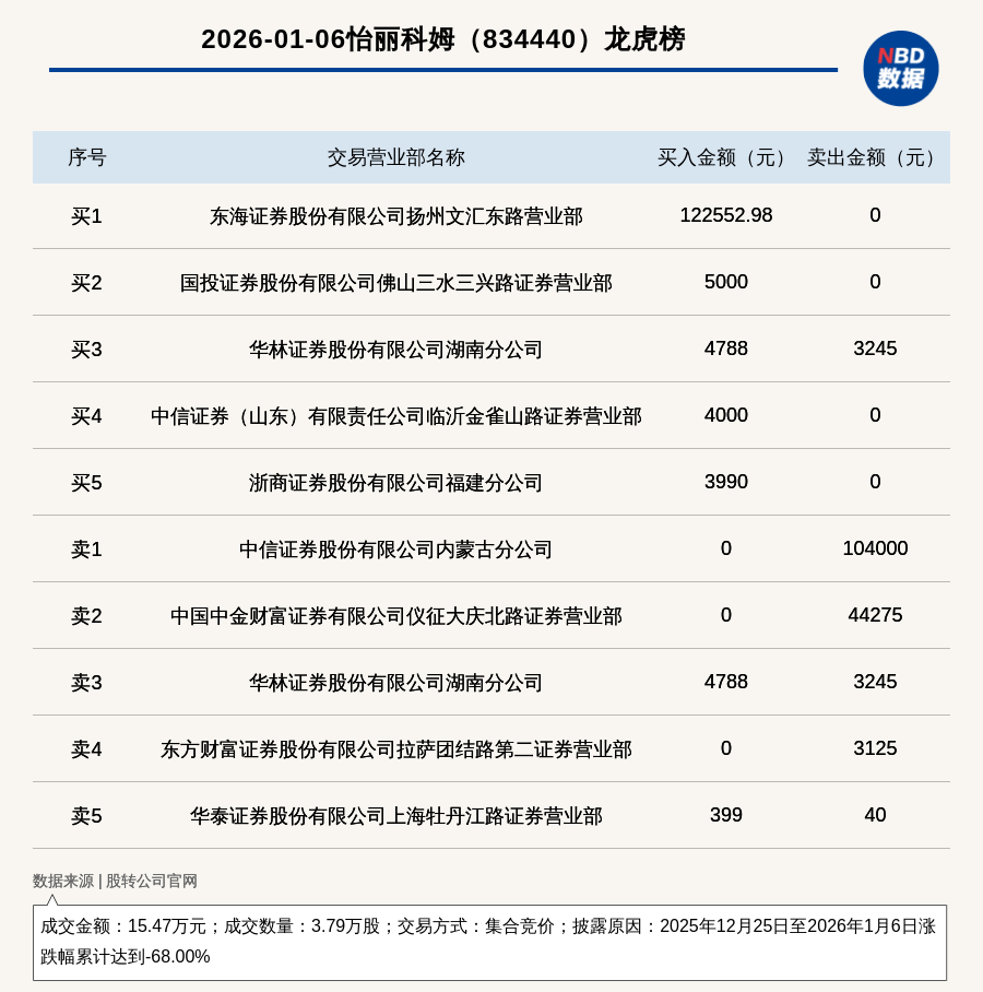 每經(jīng)訊,2026年1月6日,新三板創(chuàng)新層公司怡麗科姆(834440,收盤(pán)價(jià):4元)登上龍虎榜,交易方式是集合競(jìng)價(jià),披露原因是2025年12月25日至2026年1月6日漲跌幅累計(jì)達(dá)到-68.00%,成交數(shù)量3.79萬(wàn)股,成交金額15.47萬(wàn)元。買(mǎi)一席位為東海證券股份有限公司揚(yáng)州文匯東路營(yíng)業(yè)部,買(mǎi)入12.26萬(wàn)元;賣(mài)一席位為中信證券股份有限公司內(nèi)蒙古分公司,賣(mài)出10.4萬(wàn)元。