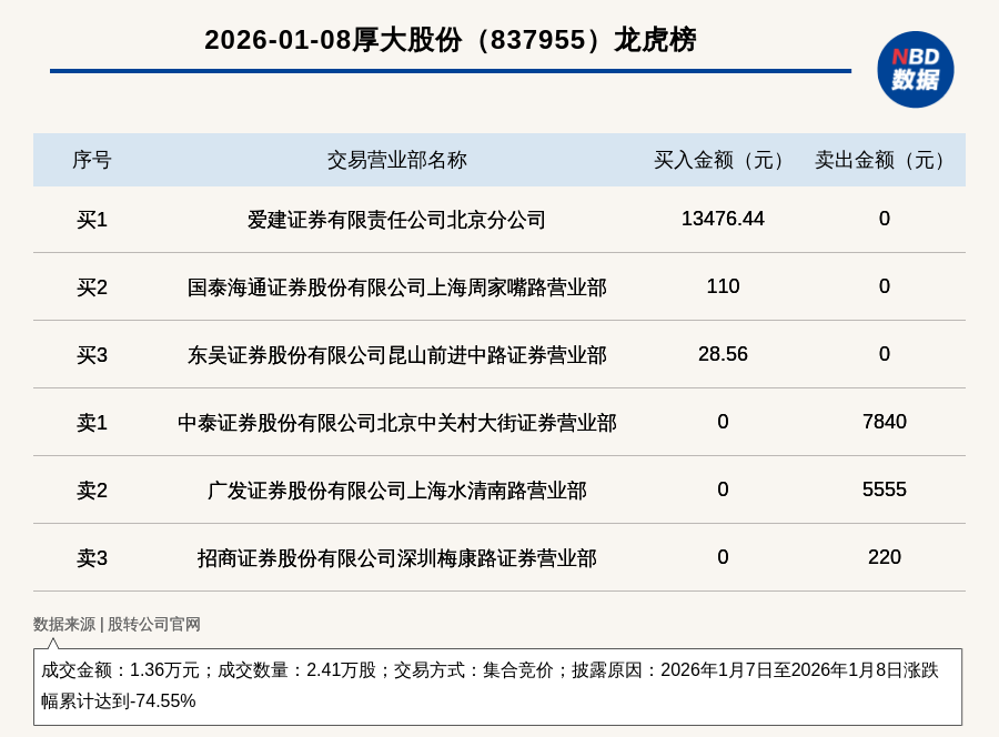 每經(jīng)訊,2026年1月8日,新三板基礎層公司厚大股份(837955,收盤價:0.56元)登上龍虎榜,交易方式是集合競價,披露原因是2026年1月7日至2026年1月8日漲跌幅累計達到-74.55%,成交數(shù)量2.41萬股,成交金額1.36萬元。買一席位為愛建證券有限責任公司北京分公司,買入1.35萬元;賣一席位為中泰證券股份有限公司北京中關村大街證券營業(yè)部,賣出7840元。