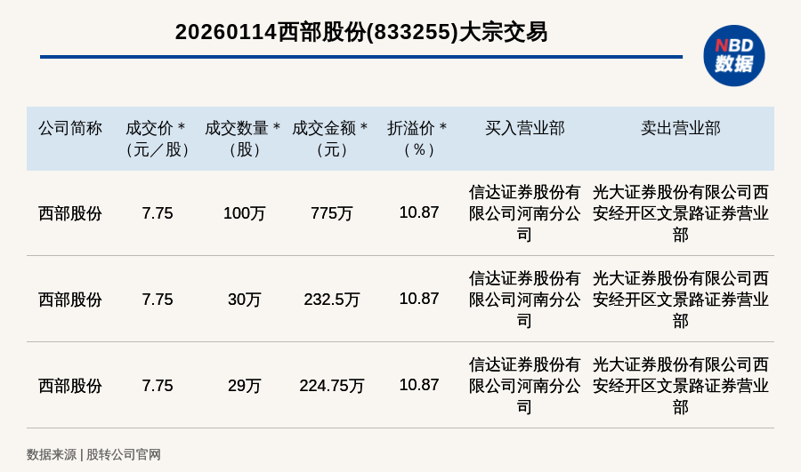 每經(jīng)訊,2026年1月14日,新三板創(chuàng)新層公司西部股份(833255,收盤價:6.99元)發(fā)生3筆大宗交易,總成交金額為1232.25萬元,成交金額最高的一筆成交價7.75元/股,成交數(shù)量100萬股,成交金額775萬元,溢價10.87%。買入營業(yè)部是信達證券股份有限公司河南分公司,賣出營業(yè)部是光大證券股份有限公司西安經(jīng)開區(qū)文景路證券營業(yè)部。