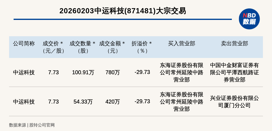 每經(jīng)訊,2026年2月3日,新三板創(chuàng)新層公司中運(yùn)科技(871481,收盤價(jià):11元)發(fā)生2筆大宗交易,總成交金額為1200萬元,成交金額最高的一筆成交價(jià)7.73元/股,成交數(shù)量100.91萬股,成交金額780萬元,折價(jià)29.73%。買入營業(yè)部是東海證券股份有限公司常州延陵中路營業(yè)部,賣出營業(yè)部是中國中金財(cái)富證券有限公司平潭西航路證券營業(yè)部。