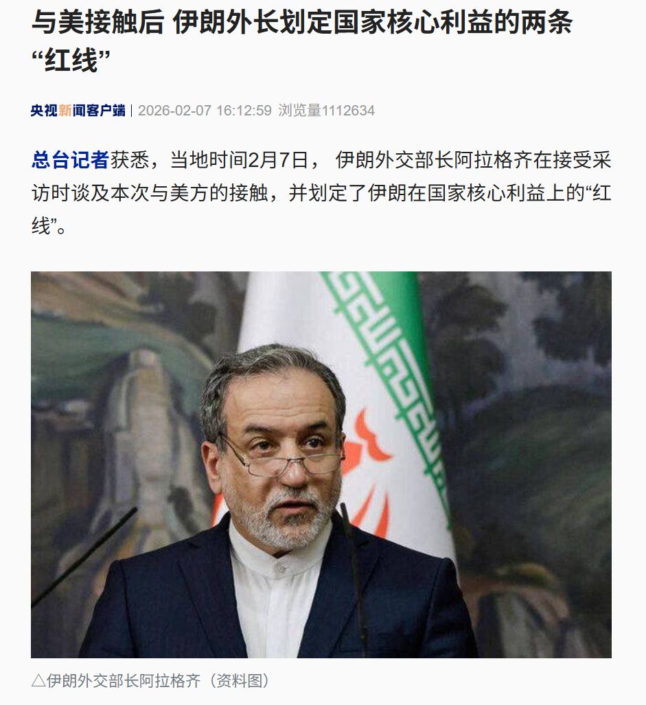 據(jù)央視新聞,總臺記者獲悉,當?shù)貢r間2月7日, 伊朗外交部長阿拉格齊在接受采訪時談及本次與美方的接觸,并劃定了伊朗在國家核心利益上的“紅線”。