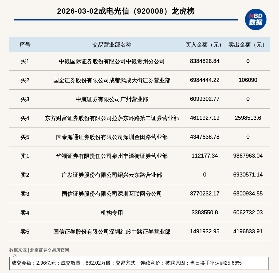 每經(jīng)訊,2026年3月2日,北交所上市公司成電光信(920008,收盤價(jià):35元)登上龍虎榜,交易方式是連續(xù)競(jìng)價(jià),披露原因是當(dāng)日換手率達(dá)到25.66%,成交數(shù)量862.02萬(wàn)股,成交金額2.96億元。買一席位為中銀國(guó)際證券股份有限公司中銀貴州分公司,買入838.48萬(wàn)元;賣一席位為華福證券有限責(zé)任公司泉州豐澤街證券營(yíng)業(yè)部,賣出986.8萬(wàn)元。
