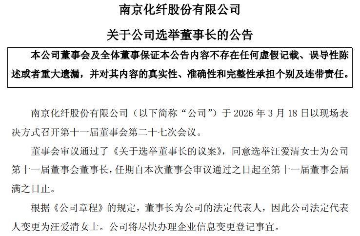 南京化纖(SH600889,股價(jià)15.99元,市值89.23億元)3月18日晚間發(fā)布公告稱,公司以現(xiàn)場(chǎng)表決方式召開(kāi)第十一屆董事會(huì)第二十七次會(huì)議。董事會(huì)審議通過(guò)了《關(guān)于選舉董事長(zhǎng)的議案》,同意選舉汪愛(ài)清為公司第十一屆董事會(huì)董事長(zhǎng),任期自本次董事會(huì)審議通過(guò)之日起至第十一屆董事會(huì)屆滿之日止。