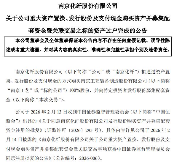 今年2月13日,南京化纖的重組方案正式獲得證監(jiān)會(huì)批復(fù)。值得一提的是,這是2026年滬深北交易所首單經(jīng)并購(gòu)重組委審核通過(guò)的項(xiàng)目。