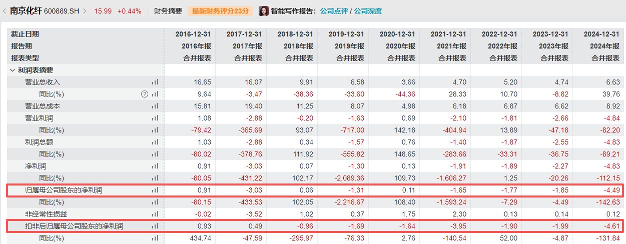 每經(jīng)記者還注意到,南京化纖近年來(lái)業(yè)績(jī)持續(xù)承壓。Wind金融終端的數(shù)據(jù)顯示,2021年—2024年,南京化纖的歸母凈利潤(rùn)已經(jīng)連續(xù)4年錄得負(fù)值。需要指出的是,2018年—2024年,公司的扣非凈利潤(rùn)更是已連續(xù)7年為負(fù)。