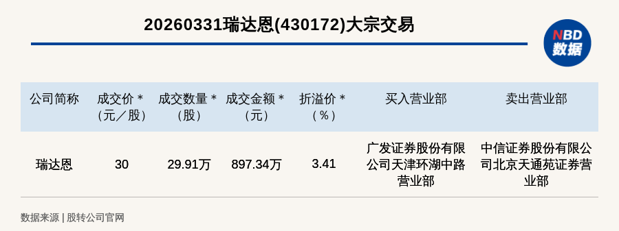每經(jīng)訊,2026年3月31日,新三板基礎(chǔ)層公司瑞達(dá)恩(430172,收盤價(jià):29.01元)發(fā)生一筆大宗交易,成交價(jià)30元/股,成交數(shù)量29.91萬股,成交金額897.34萬元,溢價(jià)3.41%。買入營業(yè)部是廣發(fā)證券股份有限公司天津環(huán)湖中路營業(yè)部,賣出營業(yè)部是中信證券股份有限公司北京天通苑證券營業(yè)部。