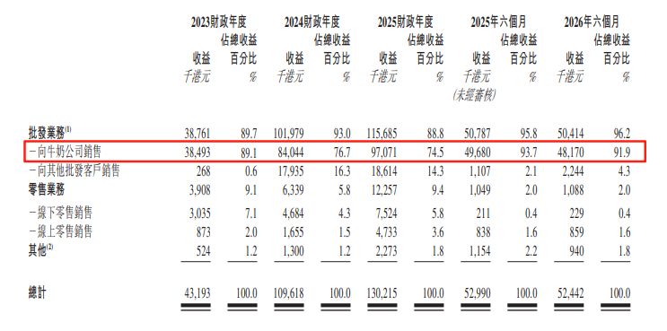招股書顯示,自與牛奶公司簽訂貿(mào)易條款協(xié)議以來,正品控股一直通過香港萬寧的零售門市及萬寧的線上渠道陳列及出售公司產(chǎn)品。最新數(shù)據(jù)顯示,超九成營收由萬寧渠道貢獻(xiàn)。具體而言,2023財年、2024財年、2025財年及2026年六個月(截至2025年9月30日),公司來自牛奶公司的收益占總營收比例分別高達(dá)89.1%、76.7%、74.5%、91.9%。