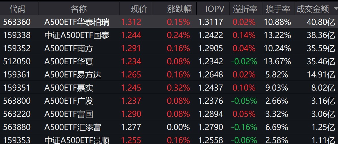 截至上午收盤,場內(nèi)多只跟蹤中證A500指數(shù)的ETF小幅上漲。其中,有10只中證A500相關(guān)ETF成交額超1億元,2只超38億元。A500ETF華泰柏瑞、中證A500ETF國泰早盤成交額分別為40.8億元、38.36億元。