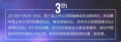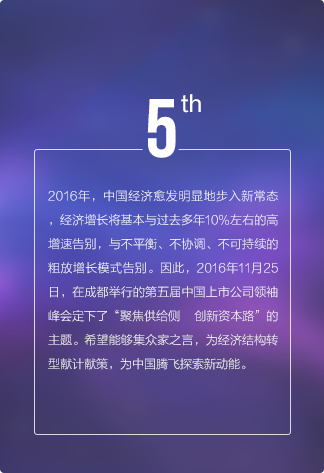 上市公司領(lǐng)袖峰會是由每日經(jīng)濟(jì)新聞主辦的中國資本市場最具影響力的大型交流平臺,最重要的年度盛會之一,峰會自2011年發(fā)起,迄今已經(jīng)連續(xù)舉辦五屆。2017年第六屆中國上市公司領(lǐng)袖峰會將以“新時代 新機遇 新?lián)?dāng)”為主題,匯聚中國數(shù)百家優(yōu)秀上市公司、上百家券商基金機構(gòu),邀請政府官員、商界領(lǐng)袖、學(xué)界專家齊聚成都,共話財經(jīng)宏圖與資本愿景。