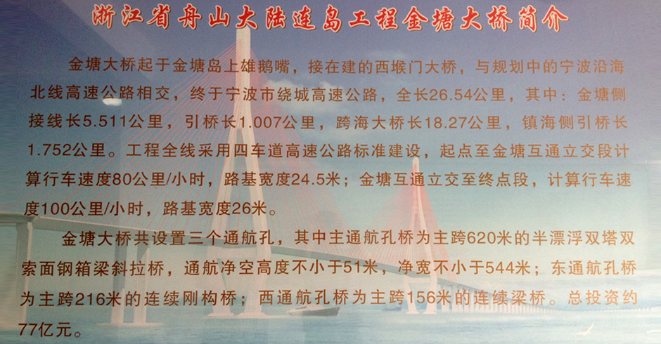 金塘大橋是舟山大陸連島工程5座橋梁中規(guī)模最大的跨海大橋,整個(gè)大陸連島工程中,二期金塘大橋與、西堠門(mén)大橋是整個(gè)舟山大陸連島工程最為關(guān)鍵一環(huán)”。