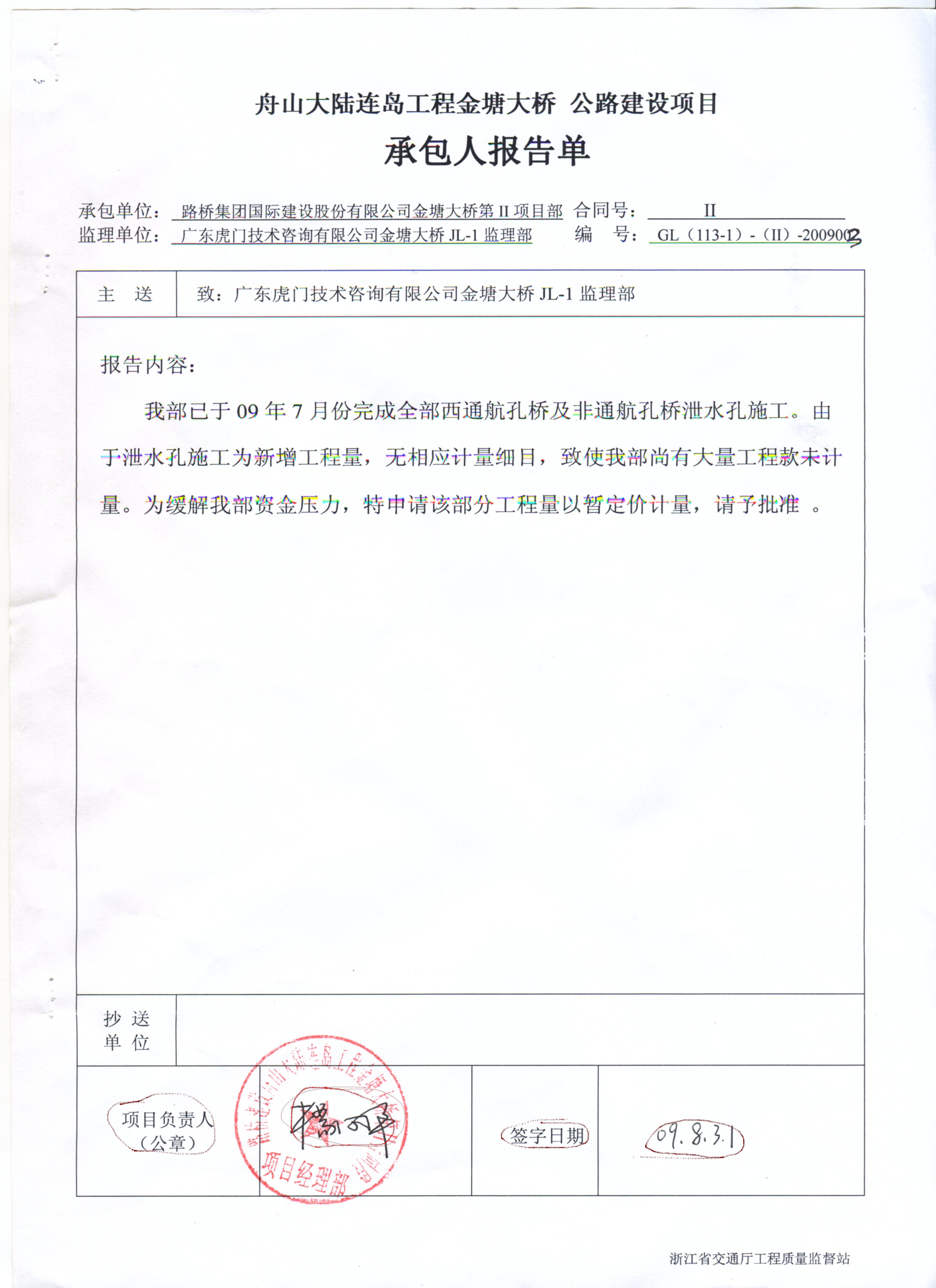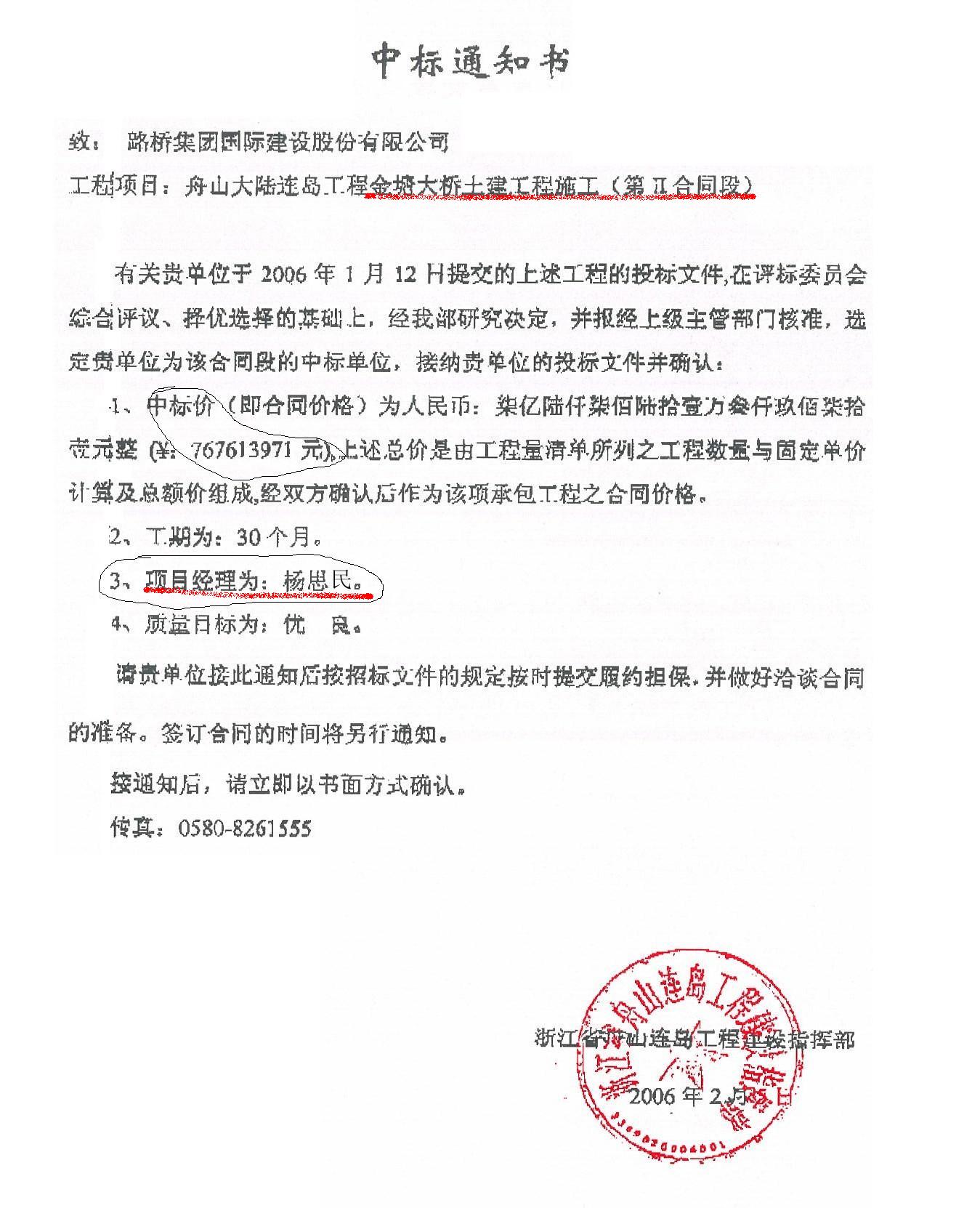 金塘大橋第Ⅱ合同段項(xiàng)目一度出現(xiàn)三個(gè)不同的項(xiàng)目經(jīng)理。根據(jù)當(dāng)初“指揮部”發(fā)給路橋建設(shè)的中標(biāo)通知書(shū)顯示,項(xiàng)目經(jīng)理為楊思民。