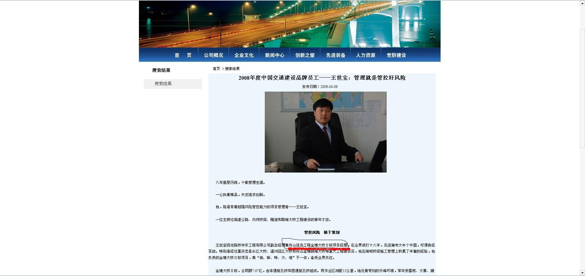 記者從路橋建設(shè)的網(wǎng)站上獲悉,現(xiàn)任路橋華東黨委書(shū)記王世寶的個(gè)人履歷介紹中顯示:“王世寶憑借在海域橋梁施工管理上積累的豐富經(jīng)驗(yàn),擔(dān)任金塘大橋第Ⅱ合同段項(xiàng)目經(jīng)理。”
